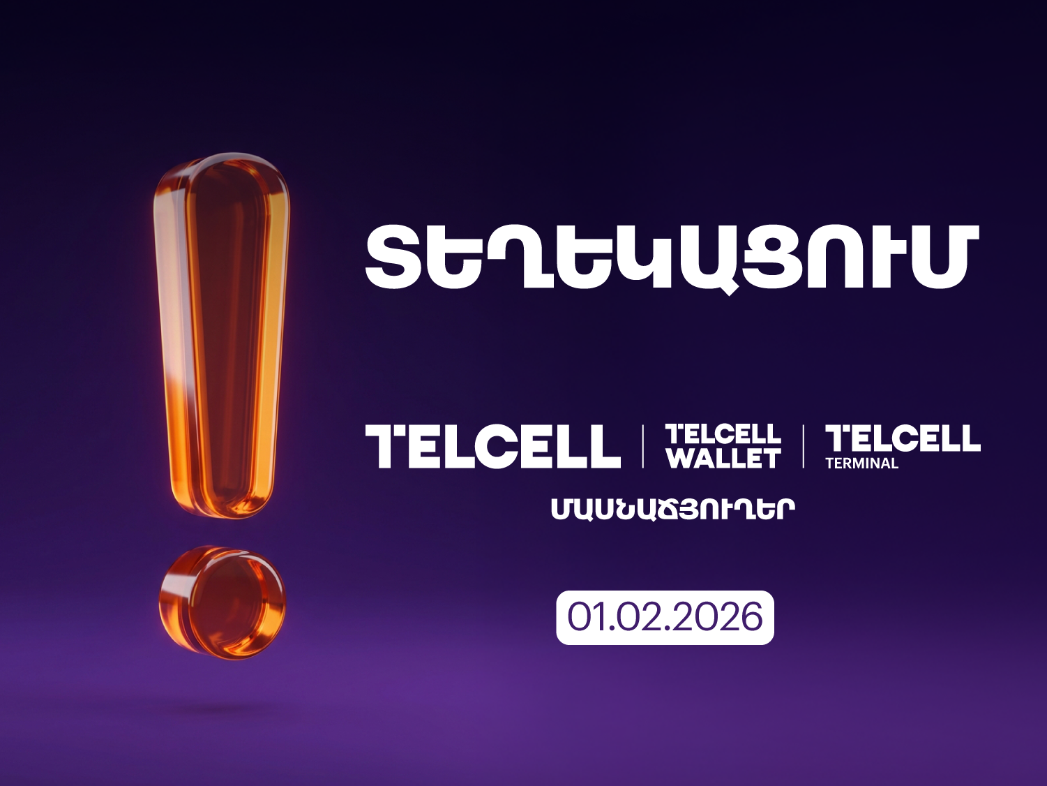 Տեղեկացնում ենք, որ «Վիվա Արմենիա» ՓԲԸ-ի կողմից համագործակցությունը միակողմանիորեն լուծելու հետևանքով 2026 թվականի փետրվարի 1-ից Telcell Terminal-ներով, Telcell Wallet բջջային հավելվածով, ինչպես նաև Telcell-ի մասնաճյուղերում այլևս չեն ընդունվելու «Վիվա Արմենիա» ՓԲԸ-ի ծառայությունների դիմաց վճարումներ։