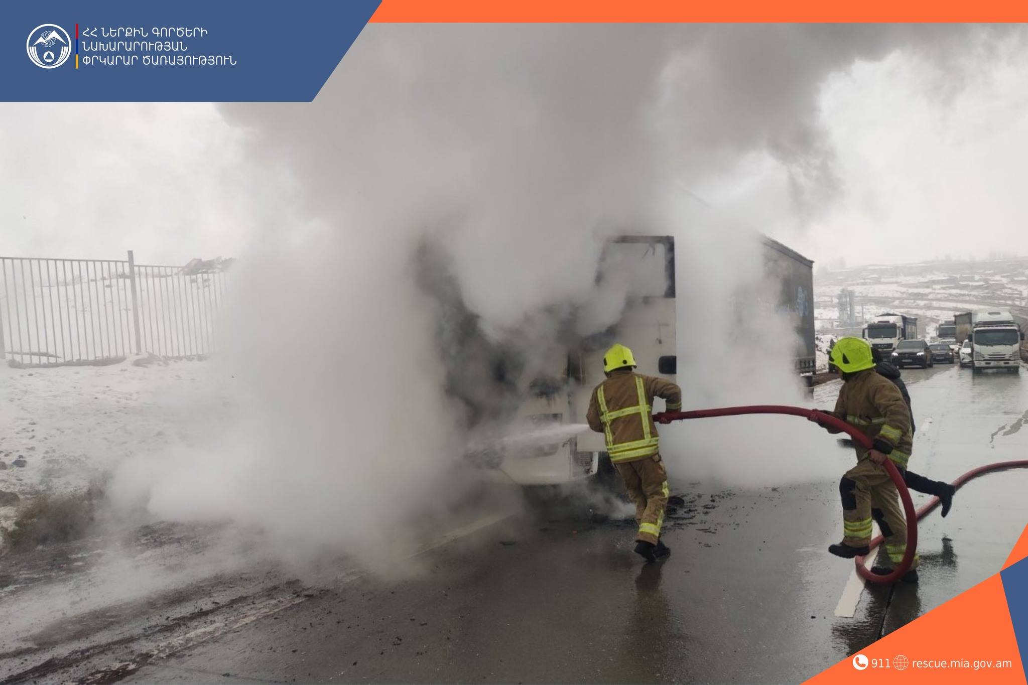 Հրդեհը մեկուսացվել է ժամը 15։02-ին, մարվել՝ 15։35ին։ Այրվել է բեռնատարի խցիկը։