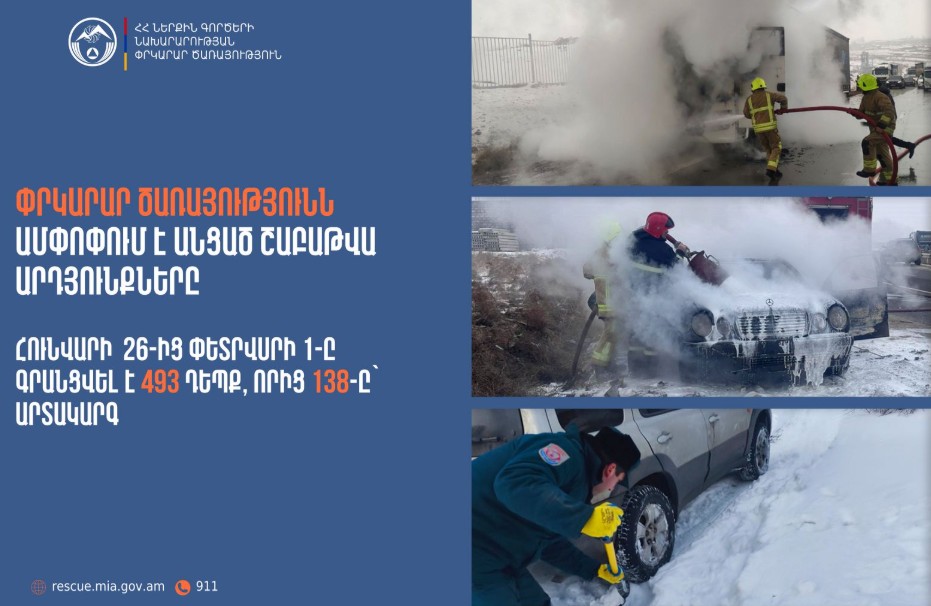 Հունվարի 26-ից փետրվարի 1-ը ՆԳՆ ՓԾ ճգնաժամային կառավարման ազգային կենտրոնում գրանցվել է 493 դեպք, որից 138-ը՝ արտակարգ: