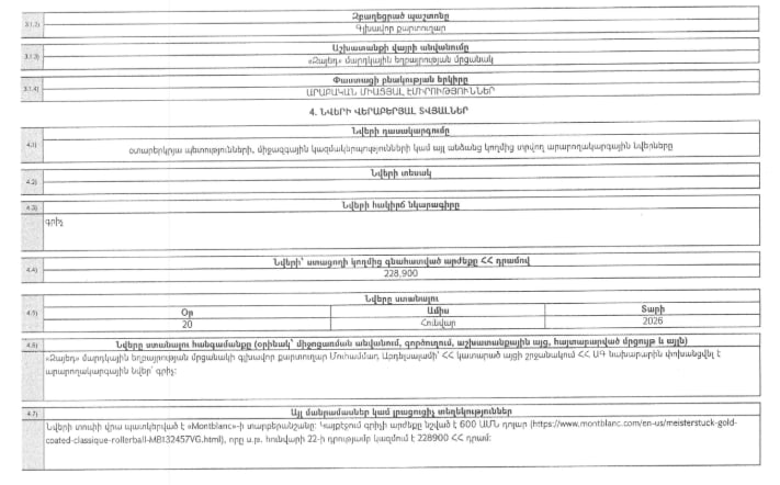 «Զայեդ» մարդկային եղբայրության մրցանակի գլխավոր քարտուղարը Միրզոյանին 228 հազար 900 դրամ արժեքով արարողակարգային նվեր է նվիրել, գրիչ, որն էլ նախարարը հայտարարագրել է Կոռուպցիայի կանխարգելման հանձնաժողովի նվերների ռեեստրում։