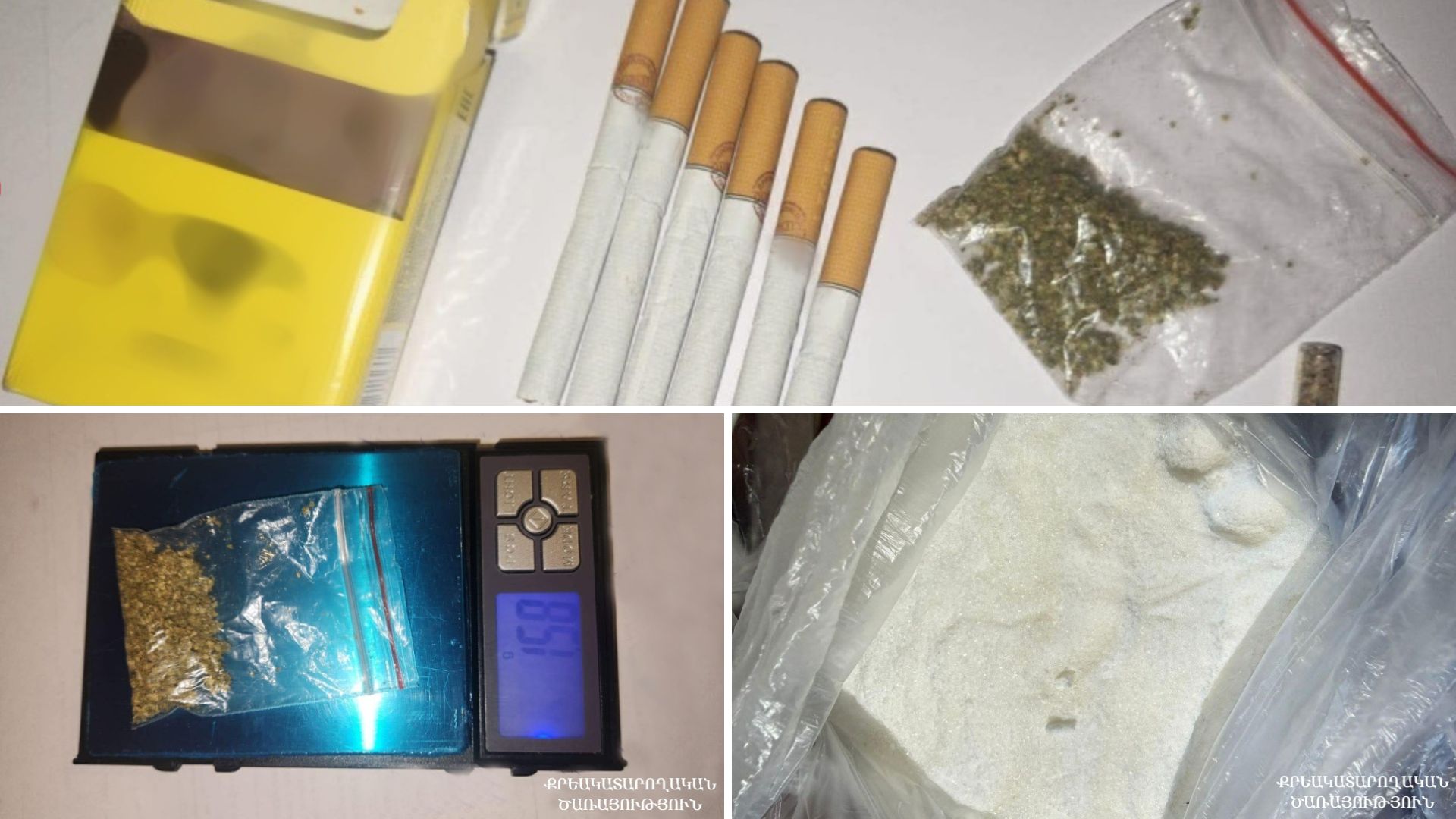 Նույն հիմնարկում մեկ այլ կալանավորված անձի անվամբ քաղաքացու կողմից բերված հանձնուքի զննությամբ ծառայողները հայտնաբերել են թմրանյութին նմանվող սպիտակ, փոշենման զանգված՝ խառնված ստվարաթղթե տուփի մեջ գտնվող շաքարավազի հետ: