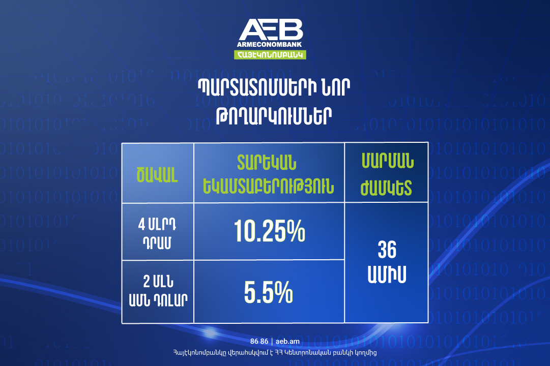 Հավելենք, որ Հայէկոնոմբանկի թողարկած դրամային և դոլարային պարտատոմսերը կարելի է ձեռբերել նաև առցանց AEB Mobile հավելվածի և AEB Online համակարգի միջոցով: AEB Mobile հավելվածը կարելի է ներբեռնել այստեղ: