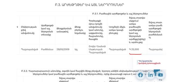 • Բանկային ավանդներ՝ 40,000 ԱՄՆ դոլար և 10,000,000 դրամ