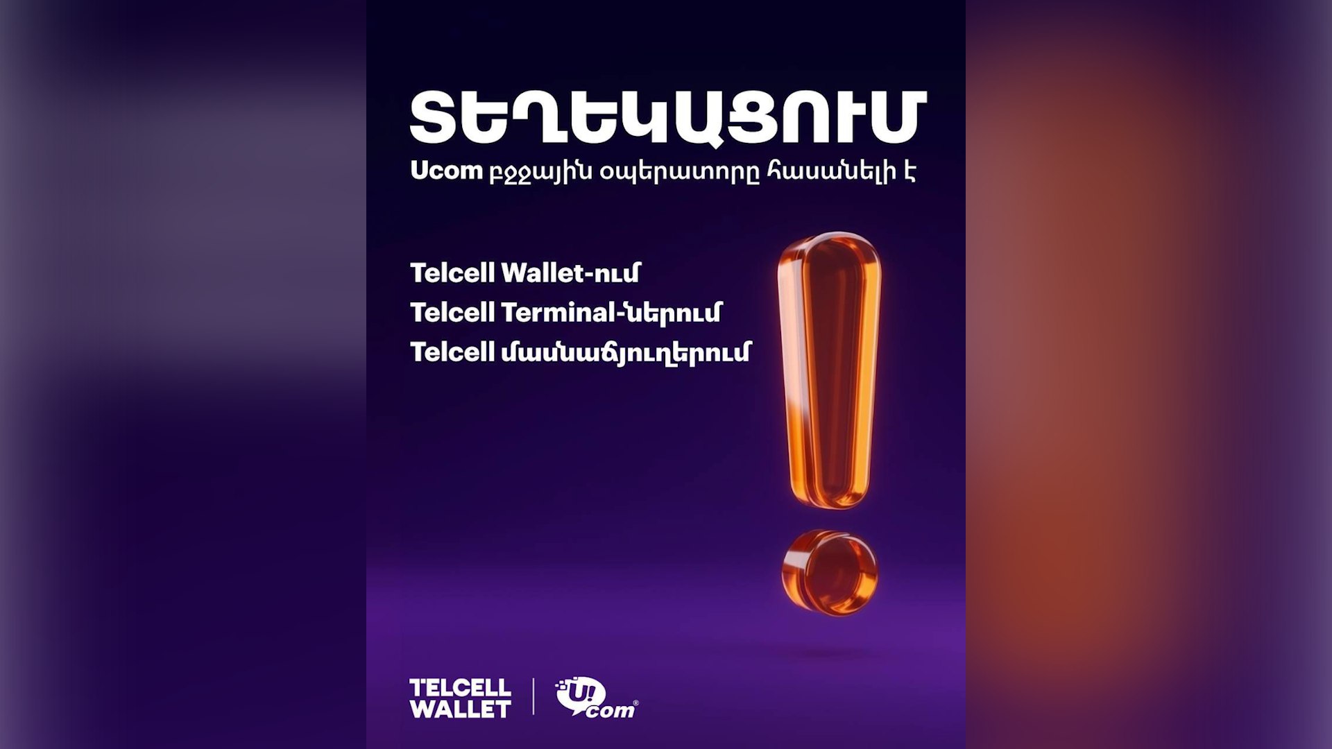 Տեղեկացնում ենք, որ մեր հաճախորդների հարմարավետությունն ապահովելու և ժամանակը խնայելու նպատակով «Թել-Սել»-ի բոլոր վճարամիջոցներով վերականգնվել են «Յուքոմ» բջջային կապի օպերատորի ծառայությունների դիմաց վճարումները