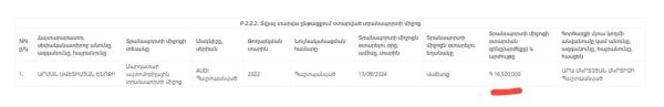 Պաշտոնյան հայտարարագրել է նաև մեկ տրանսպորտային միջոց՝ Audi 2022, որը ստացել է նվիրատվությամբ 2023 թվականի հունիսի 28-ին։ Ումից, ինչ ծառայության դիմաց է ստացել նվիրատվությունը, հայտարարագրից պարզ չէ։ 2024 թվականին վաճառում է նշված մեքենան 16,500,000 դրամով։