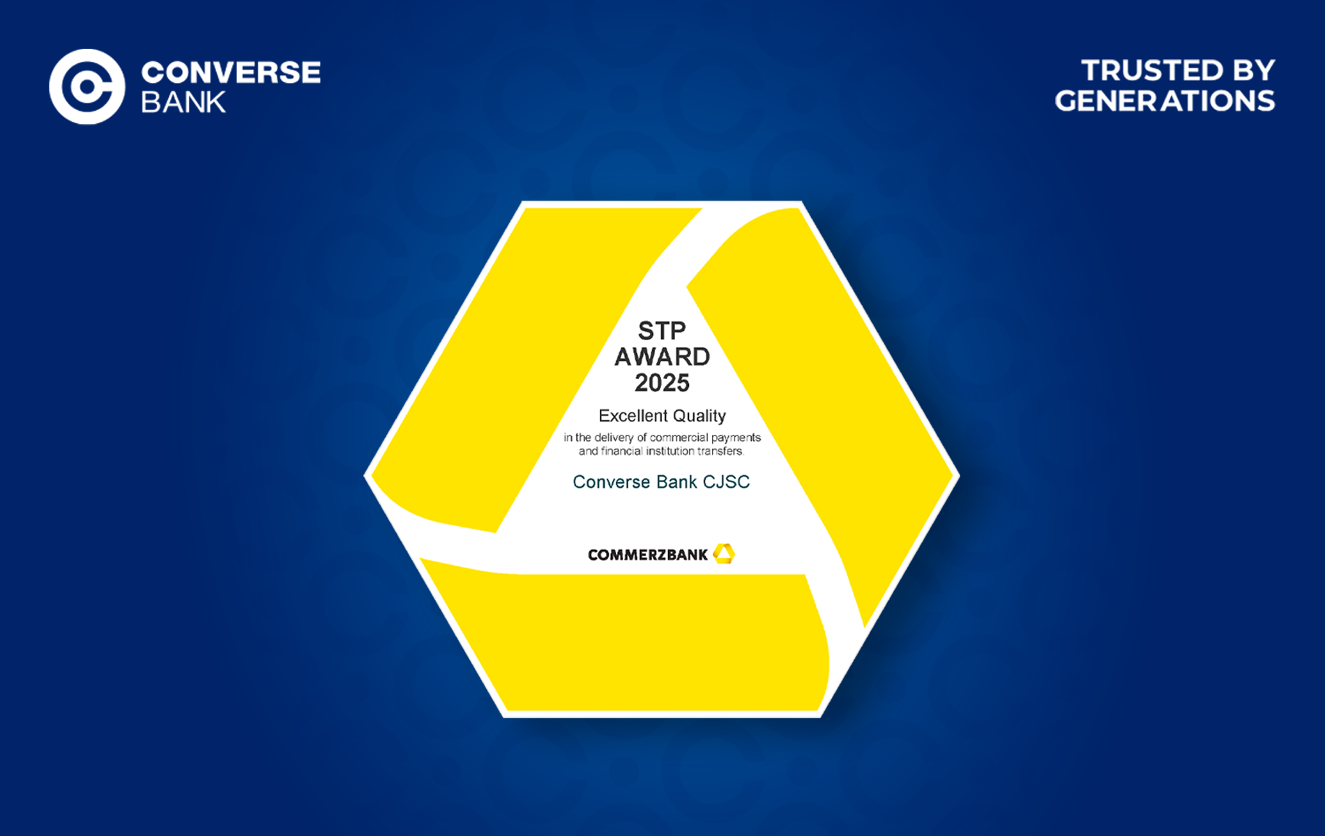 Կոնվերս Բանկին հերթական անգամ շնորհվել է SWIFT փոխանցումների որակի գերազանցության STP Excellence Award մրցանակը Commerzbank-ի կողմից: Մրցանակը վկայում է 2025 թվականի ընթացքում միջազգային փոխանցումների քանակական և որակական համապատասխանության, ինչպես նաև բարձր կատարողականի ապահովման մասին։