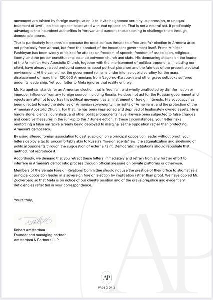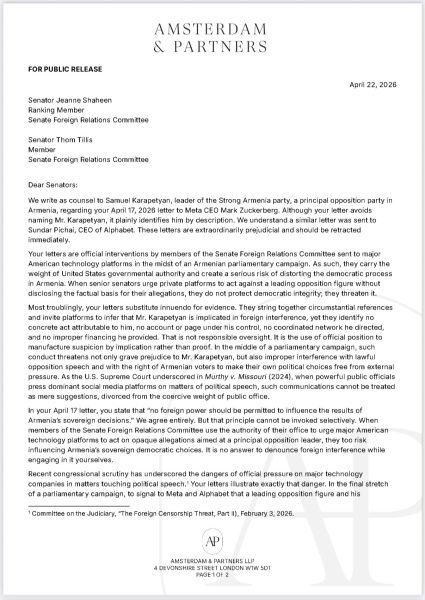 Մենք ներկայացնում ենք «Ուժեղ Հայաստան» կուսակցության առաջնորդ և Հայաստանի գլխավոր ընդդիմադիր գործիչ Սամվել Կարապետյանի շահերը։ Սույնով դիմում ենք ձեզ՝ կապված Meta-ի գործադիր տնօրեն Մարկ Ցուկերբերգին ուղղված ձեր 2026թ. ապրիլի 17-ի նամակի հետ: Թեև ձեր նամակում պարոն Կարապետյանի անունը ուղղակիորեն չի նշվում, նկարագրությունն ակնհայտորեն վերաբերում է հենց նրան։ Մեզ հայտնի է նաև, որ նույնաբովանդակ նամակ է ուղարկվել Alphabet-ի գործադիր տնօրեն Սունդար Պիչայիին: Այս նամակները ծայրաստիճան կանխակալ են և պետք է անհապաղ հետ կանչվեն:
