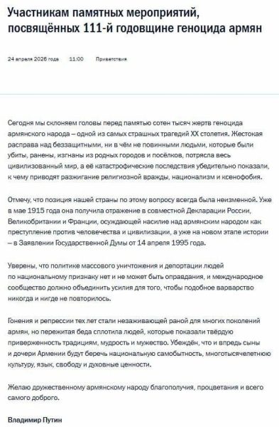 ՌԴ նախագահ Վլադիմիր Պուտինը ուղերձ է հղել Հայոց ցեղասպանության 111-րդ տարելիցի կապակցությամբ։