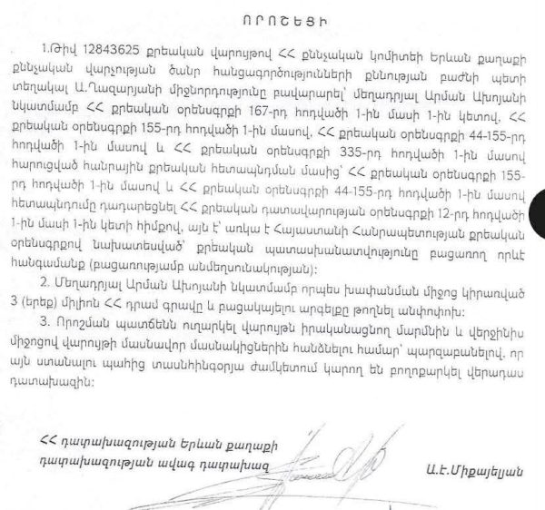 Հայտնել էինք, որ երկու անձ աստիճանը դրել էին Ռոստովյան 17 շենքի մուտքի մոտ և փորձել էին մտնել շենքի բնակիչներից մեկի տուն՝ սպանության փորձի համար տնային կալանքի տակ գտնվող Արման Ախոյանի բնակարան։