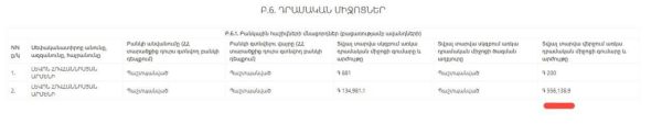 Բանկային հաշիվներում առկա գումարները կազմել են ընդհանուր 2,603,773 դրամ, իսկ կանխիկ դրամը՝ 2,500,000 դրամ։